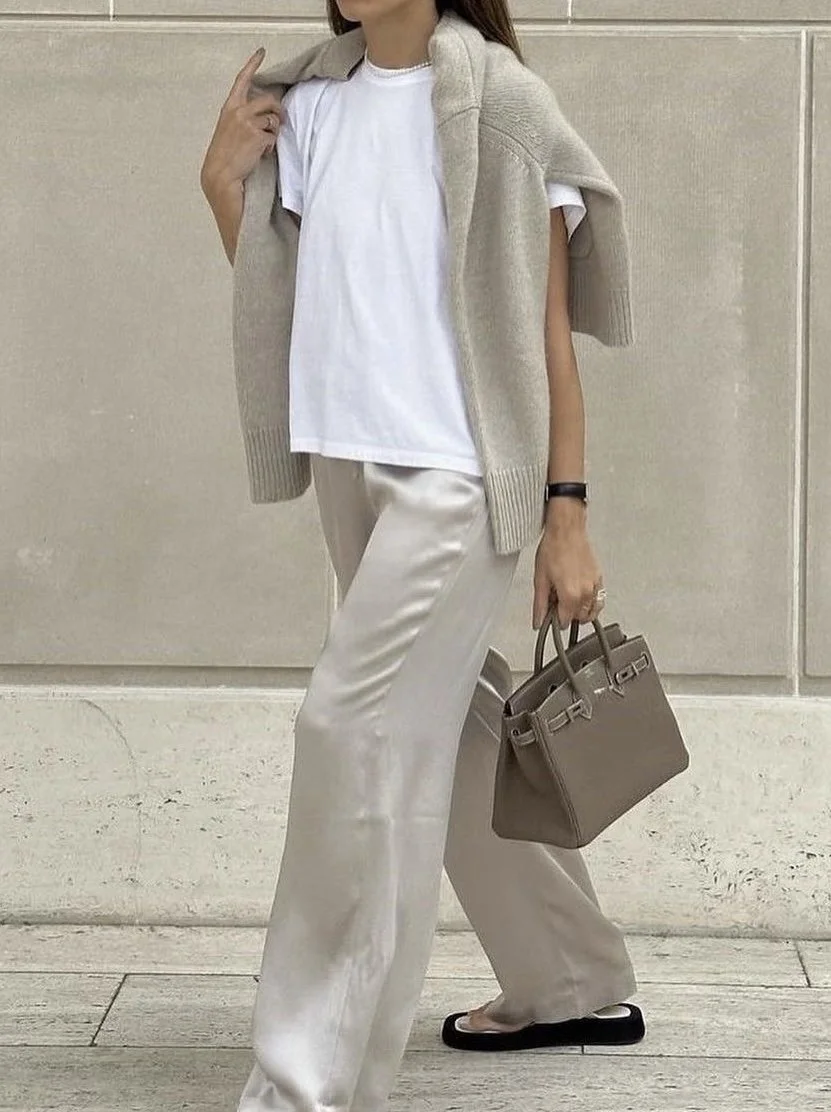 A relaxed silk or satin button-down with coordinating trousers. Worn with leather slides and subtle jewelry, this look feels intentional but effortless.
