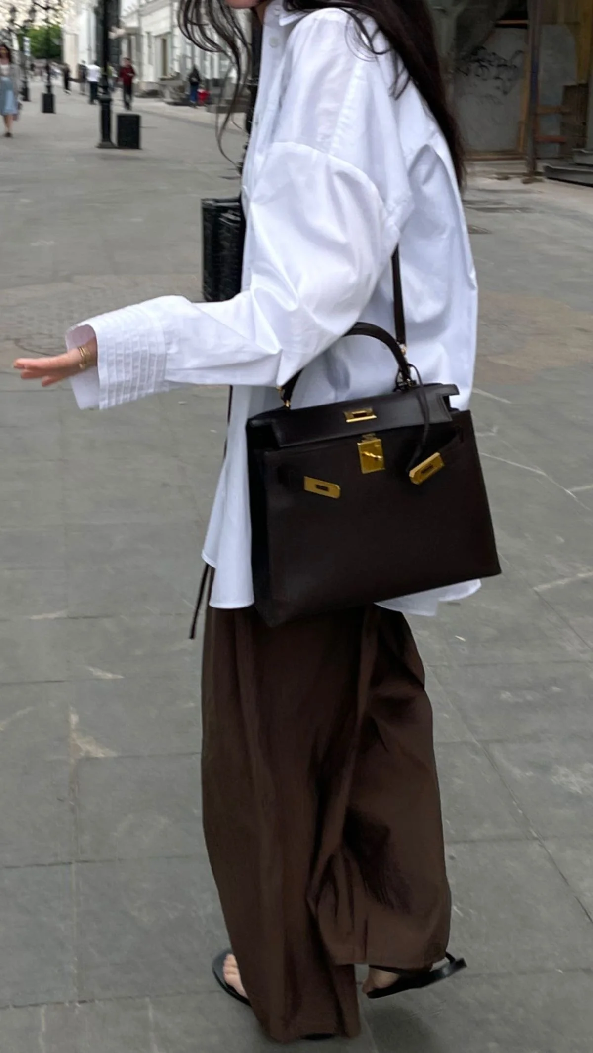 A voluminous white shirt meets rich chocolate trousers. The look is all about proportion play. Style with leather sandals and a structured bag.