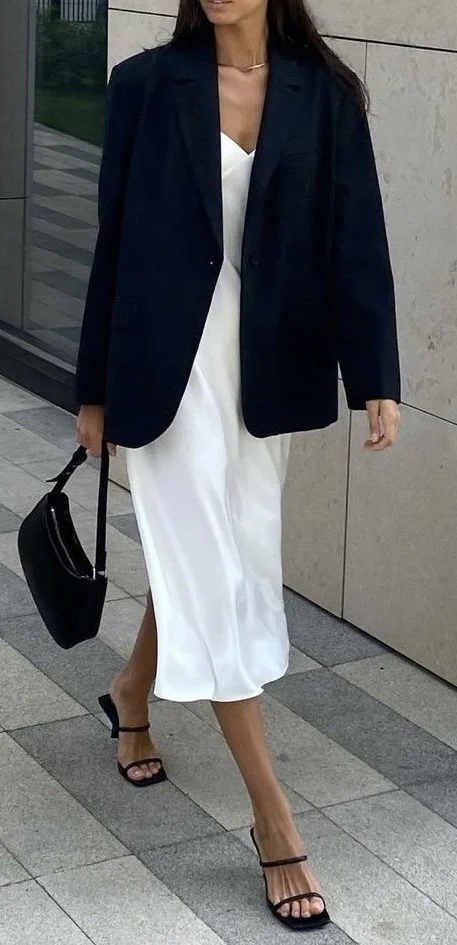 A fluid white slip dress layered with a boxy black blazer and strappy sandals. Monochrome magic meets fluid femininity—this look balances structure with soft sophistication.