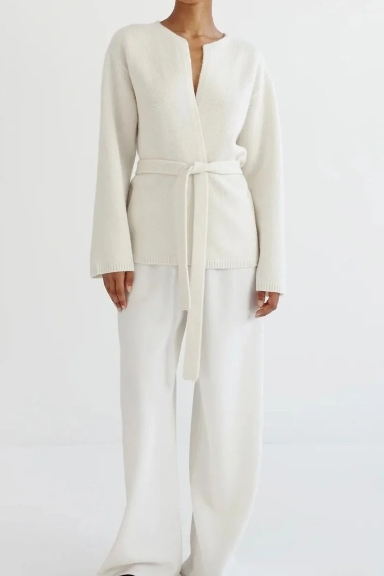 A neutral tonal knit wrap cardigan cinched at the waist paired with relaxed wide-leg cream trousers. Understated but impactful—soft power dressing at its best.