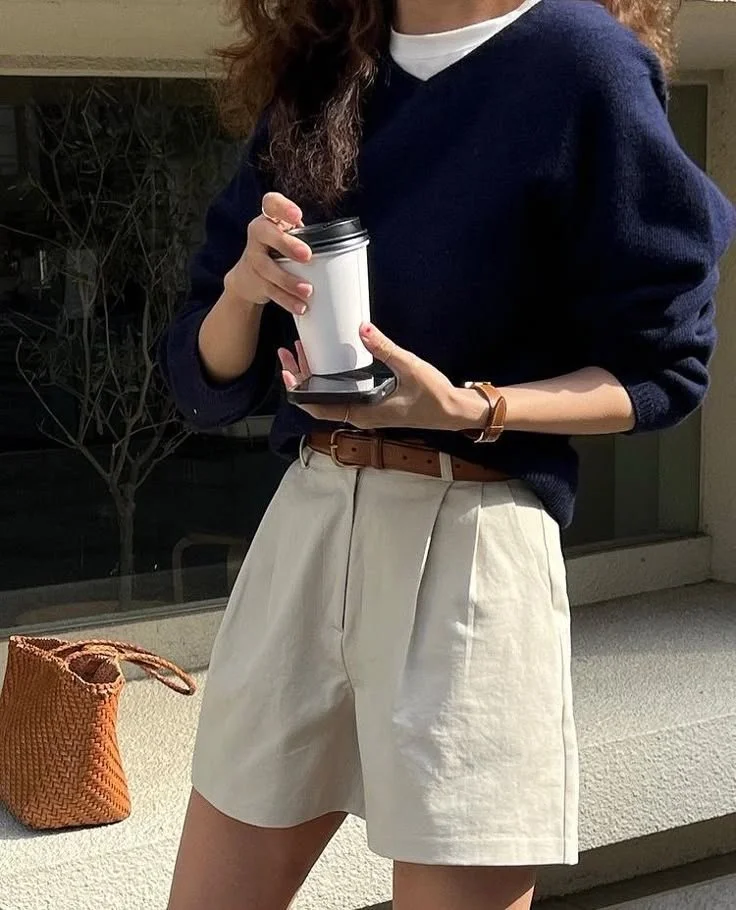 A navy pullover layered with a white tee, tucked into pleated beige Bermuda shorts with a brown belt. Understated preppy and incredibly polished.